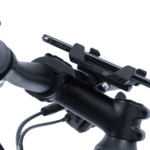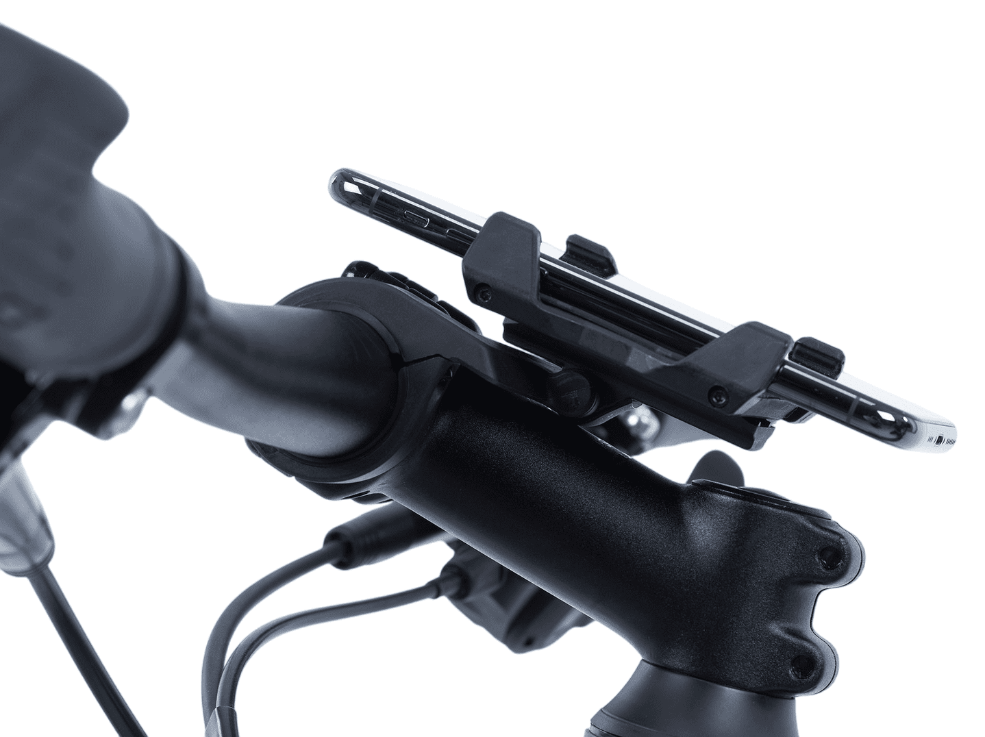 Adjustable phone mount, for a phone width of 58 – 97 mm, fits all phone lengths, use in portrait or landscape mode, infinitely variable portrait-mode adjustment, adjustable angle, phone sits in the middle of the stem, silicone pads for strong hold.